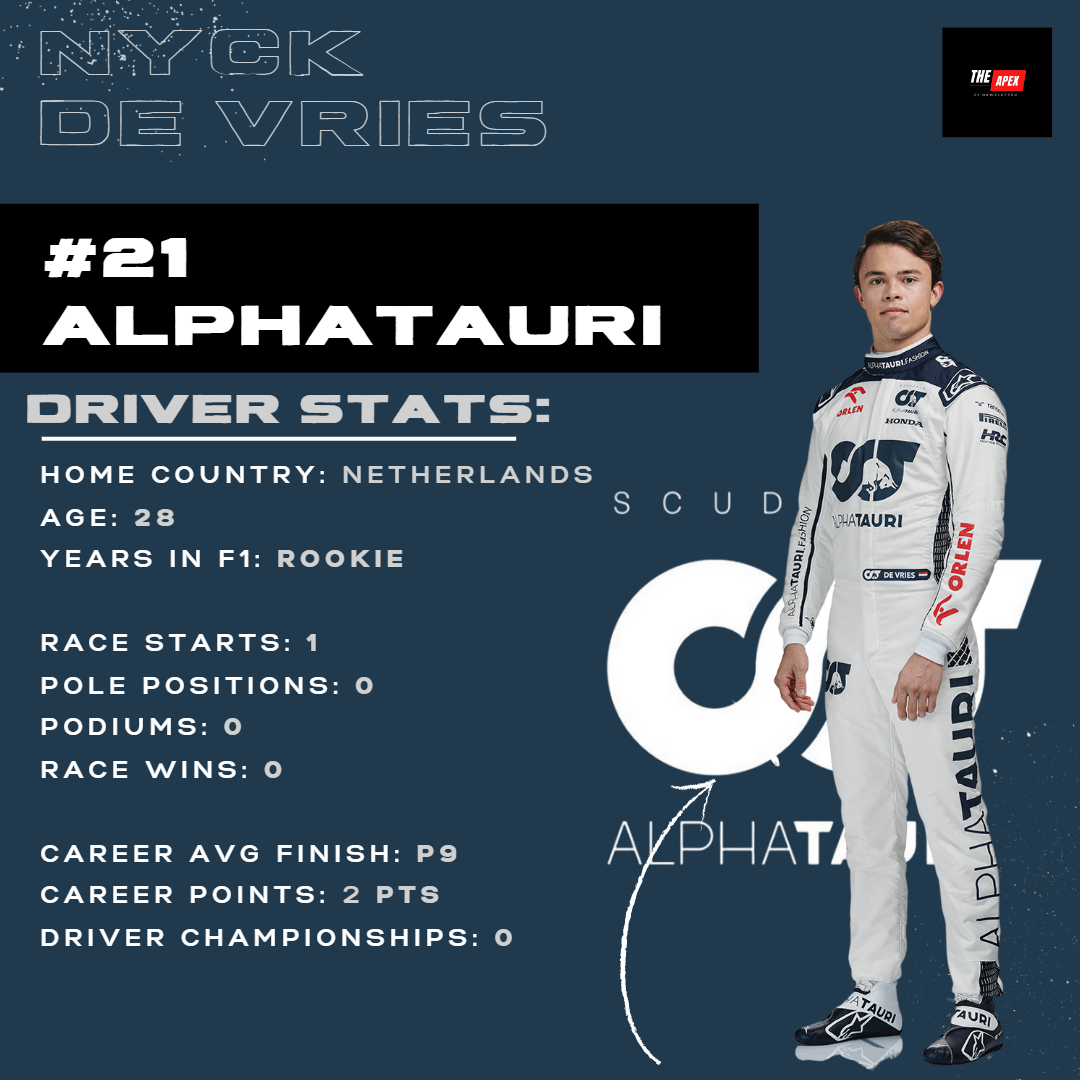 Nyck de Vries is a seasoned rookie if you could call it that. The 28 year old was a Formula E champion with Mercedes and will be looking to translate that success into F1. AlphaTauri did not look very quick in testing so it may be a challenging year for him. Last year he was able to score points racing for Williams, who finished the season in last place. So we know he has it in him to pull out quality performances in cars that are not competitive. Its a question on how often he will be able to do it for AlphaTauri. +